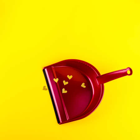 Pink dust pan with shiny golden Heart shape stickers on yellow background. Devaluation of love. Disrespect concept. Symbol of love for Happy Women's, Mother's, Valentine's Day.