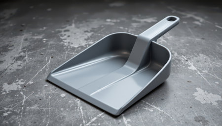 plastic dustpan on gray background, silver tones, subject at bottom with copy space at top.