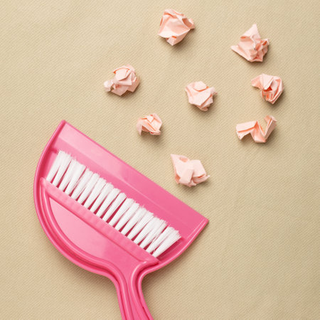 Crumpled paper balls and pink broom on beige fabric background. flat lay, top view, copy space