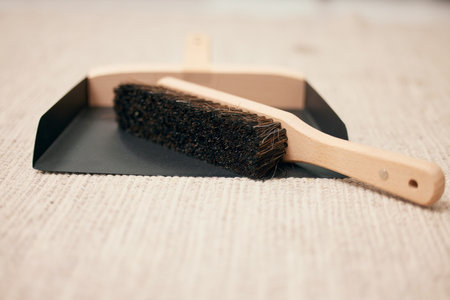 Scoop, brush and cleaning for home sweeping with healthy hygiene on carpet for chores, dirt or wellness. Dustpan, housekeeping and duties on floor in apartment for crumb mess, service or domestic