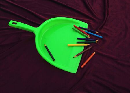 green garbage cleaner with color pencil isolated on brown background