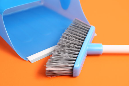 Brush and dustpan in female gloved hand on orange background