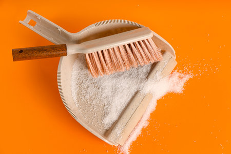 Dustpan with sugar and brush on orange background