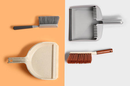 Dustpans with cleaning brushes on color background