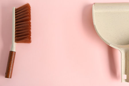Dustpan and brush on pink background