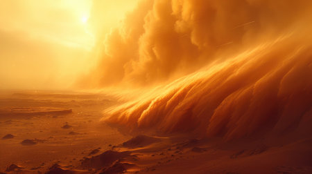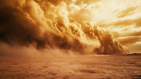 A dramatic dust storm fills the sky over a barren landscape, creating a striking contrast between the earthy tones and the dramatic golden clouds.