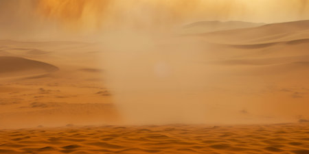 Sandstorm in desert. wind and orange sand clouds. Dunes landscape. Generative AI.