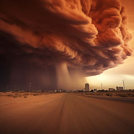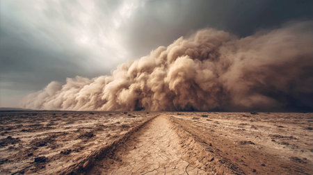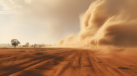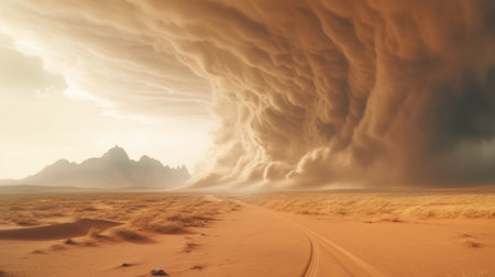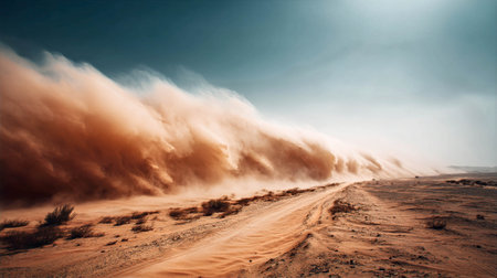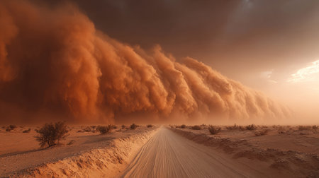 Dust storm approaching road in desert landscape with dramatic sky and natural elements concept