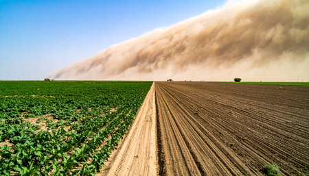AI Generated. Powerful Dust Storm Sweeping Across Vast Farmland Landscape