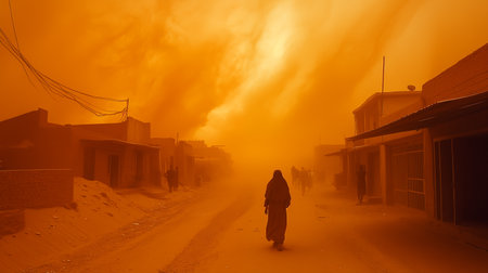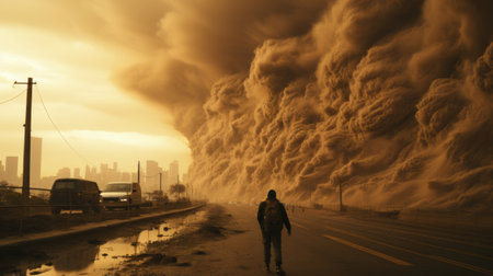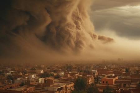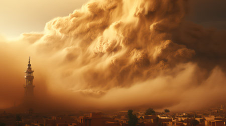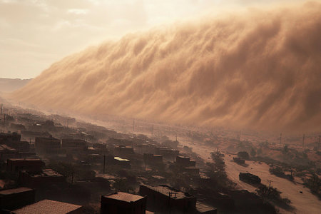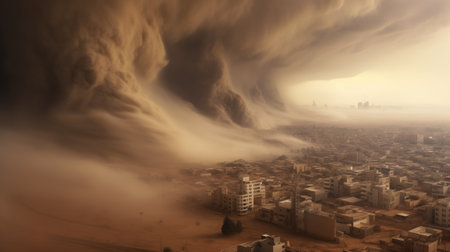 A colossal dust storm looms over a sprawling city, engulfing the skyline with thick clouds of dust and creating an apocalyptic scene, as sunlight struggles to penetrate the dense atmosphere. AI generated image