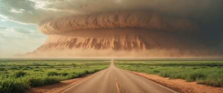 AI Generated. Powerful Dust Storm Approaching Over Green Landscape and Road