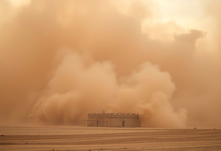 A powerful dust storm engulfs a dry landscape, with an isolated building standing firm against the elements in the late afternoon light.