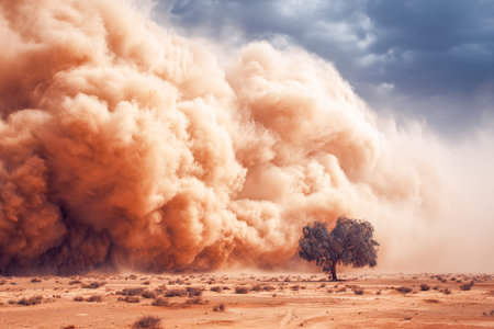 A solitary tree stands amidst a barren desert as an enormous, swirling dust cloud advances ominously on the horizon, evoking a sense of nature's power