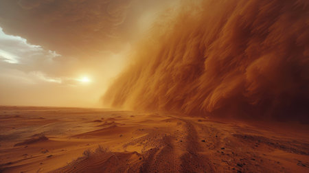 A breathtaking view of a dust storm advancing through a desolate desert, capturing the dynamic interplay of light and atmospheric conditions during sunset.