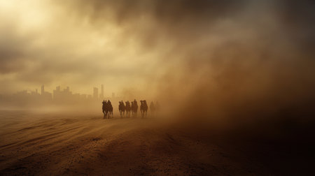 A dust storm engulfs a city skyline and road creating a hazy atmosphere. The image showcases the city's architecture and a road leading towards it. The scene presents a warm, desaturated color palette and a sense of isolation. Suitable for a range of commercial applications like travel or environmental themes.