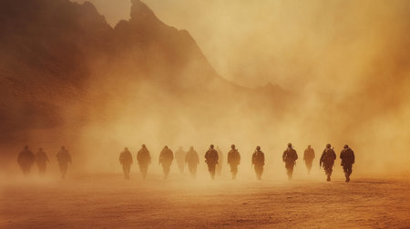 Group of soldiers walking in formation in the desert, with dust behind, generative ai