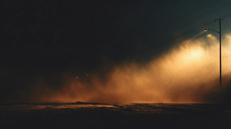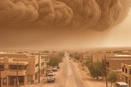 An AI generated illustration of atmospheric dust descending from a dark cloud, blanketing the street