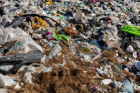 Pollution concept. Garbage pile in trash dump or landfill. Garbage dump, various trash and waste material, environmental pollution and ecology concept, selective focus