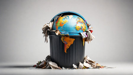 This image depicts a globe engulfed in trash, highlighting the urgent issue of global waste and its effects on our environment and society.