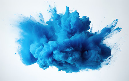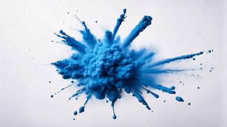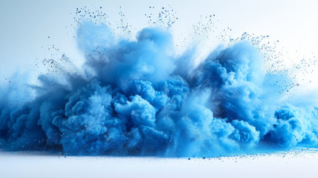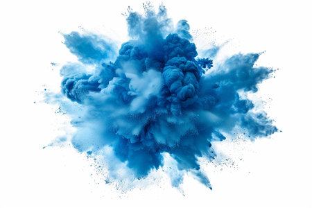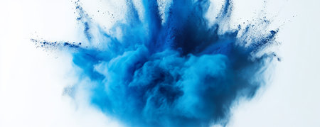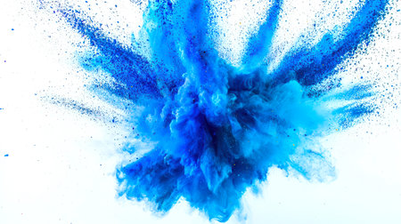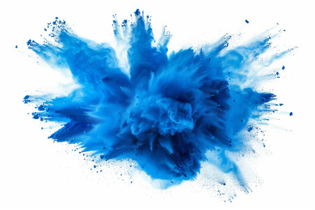 A dramatic blue powder explosion spreading outward from the center, captured against a white background. Perfect for bold and energetic design elements.