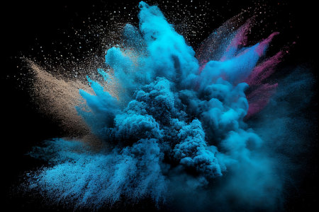 Freeze motion of blue dust explosion creating a colorful cloud on black background