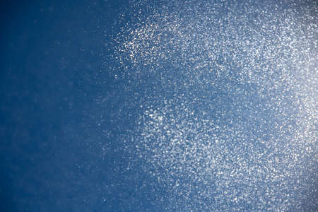 Water splash. Fluid drop. Defocused blue shimmering smoke paint cloud sparkling liquid blob floating on abstract light background.