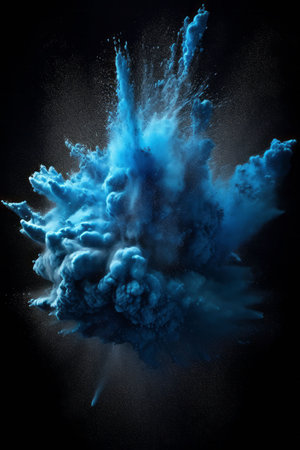 A dramatic burst of blue smoke expands against a solid black background, creating a striking contrast. The swirling, cloud like formation captures the dynamic motion and intensity of the explosion. AI generated.