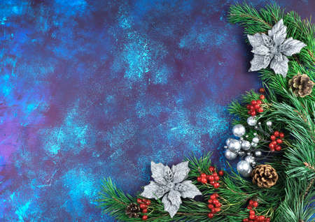 Happy new year 2021, Christmas background made of blue concrete with fir branches decorated with silver flowers, red viburnum and cones. The concept of the new year 2021 and Christmas.