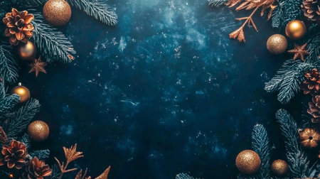 This beautiful holiday-themed image showcases a rich blue background framed with pine branches, golden snowflakes, and pine cones, perfect for winter celebrations and festive decor.