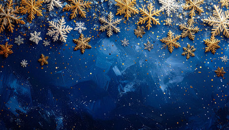 Artistic top-view holiday composition with matte navy tones and shimmering metallic snowflakes.