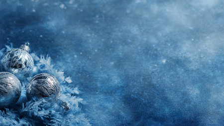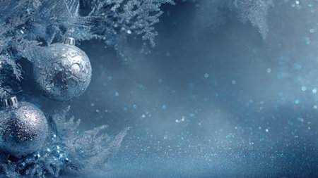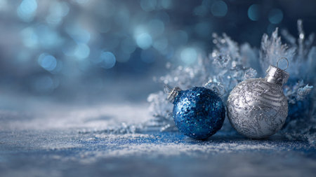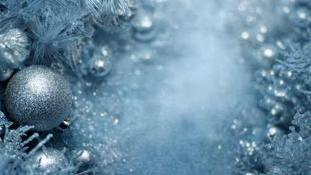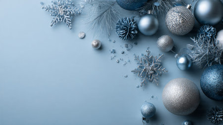 Sophisticated Christmas background showcasing silver decorations on icy blue textures with a refined winter mood.