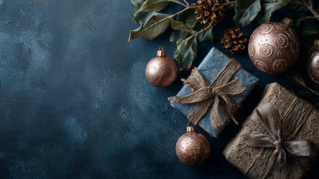 Festive Christmas Decorations with Blue and Gold Ornaments on Dark Background