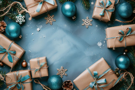 Christmas flatlay background in blue shades with Christmas balls, gift boxes, snowflakes, cones and fir tree twigs. Copy space, top view...