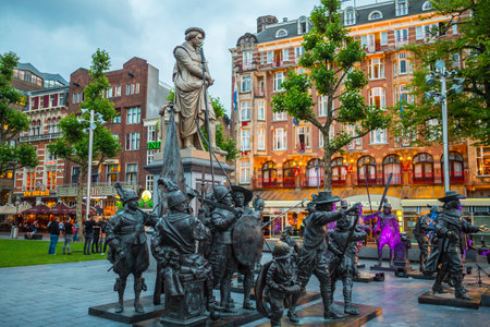 Amsterdam, the Netherlands - July 1, 2019: De Nachtwacht compostion of statues on Rembrandtplein in front of beige tall statue of Rembrandt Van Rijn, with booking.com office buildign in back.