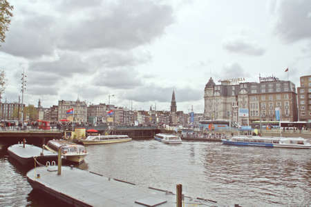 Amsterdam, Holland; 04 30 2016. Canals and boats in Stationsplein (English: Station Square), Amsterdam. Docking area for tour boats.