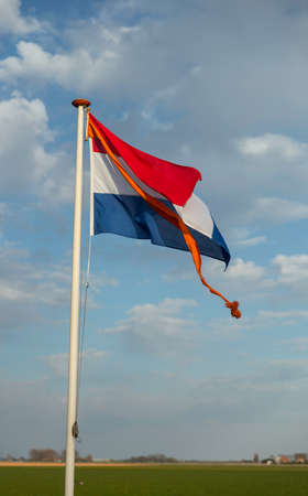 Netherlands flag. Dutch national symbol waving on pole against blue sky with clouds, sunny day
