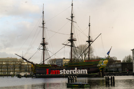 Amsterdam, The Netherlands, October 09, 2018: Ffluttering holland flag and roof of maritime museum on background