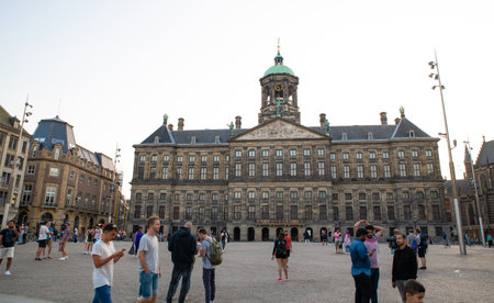 AMSTERDAM-HOLLAND- JULY 29, 2019: Dam Square, one of the busiest places in town, is dominated by the Royal Palace.