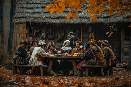 A diverse group of individuals sitting around a table engaged in a discussion or meeting, A rustic representation of the first Thanksgiving with Pilgrims and Native Americans, AI Generated