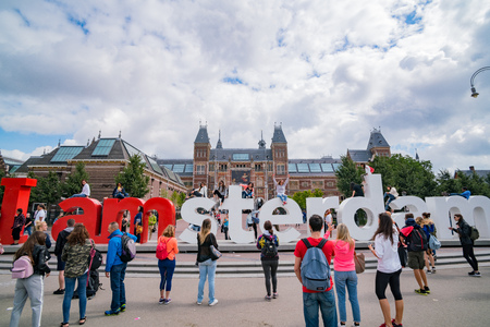Amsterdam, Netherlands - September 9, 2018: Big corporeal sign of I Amsterdam with people around in Museumplein (Museum Square) and Rijksmuseum (National Museum) in Amsterdam, Netherlands