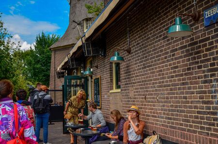 Amsterdam, Holland, August 2019. The Brouwerij't IJ brewery is housed in a mill which retains all its original charm. People enjoy the excellent artisan beer at the tables. Red brick building.