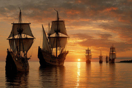 Four majestic sailing ships glide across calm waters as the sun sets, casting vibrant colors in the sky. The scene captures the tranquility of evening on the sea.