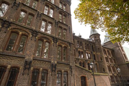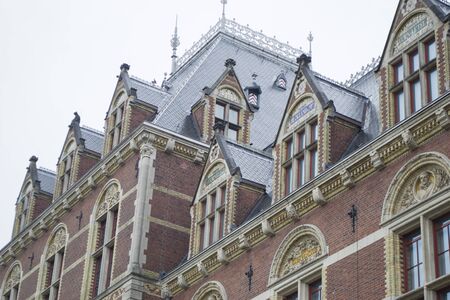 Amsterdam, Netherlands - 5th June, 2019: Dutch national art museum. Closeup of part of the Reichsmuseum building in Amsterdam. Decorations and detailes of the facade, roof and windows of the museum building.