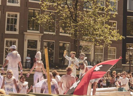 Amsterdam, Netherlands - 27 April, 2017: Local people and tourists dressed in orange clothes ride on boats and participate in celebrating King's Day along the canal of Amsterdam. Typical architecture