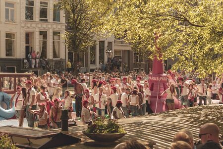 Amsterdam, Netherlands - 25 April, 2017: Local people and tourists ride on boats under narrow bridges and participate in celebrating King's Day along the canal and promenade of Amsterdam.