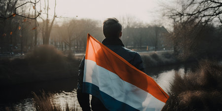 An AI generated illustration of a person holding the flag of the Netherlands in a park