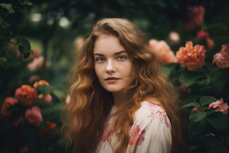 Portrait of a woman with rosy cheeks and wavy hair in a Romantic garden
