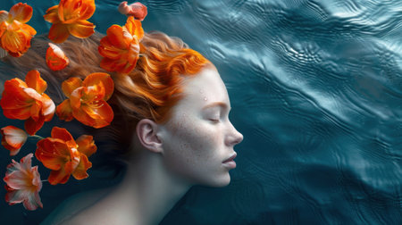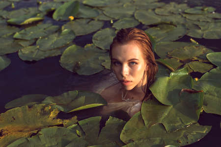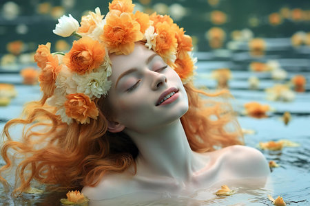 Beautiful young woman with flowers in hair floating in the water.