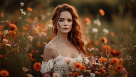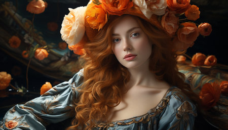 A woman with red hair surrounded by white flowers and leaves, AI