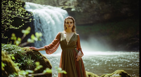 Beautiful woman in a long green dress standing in front of a waterfall
